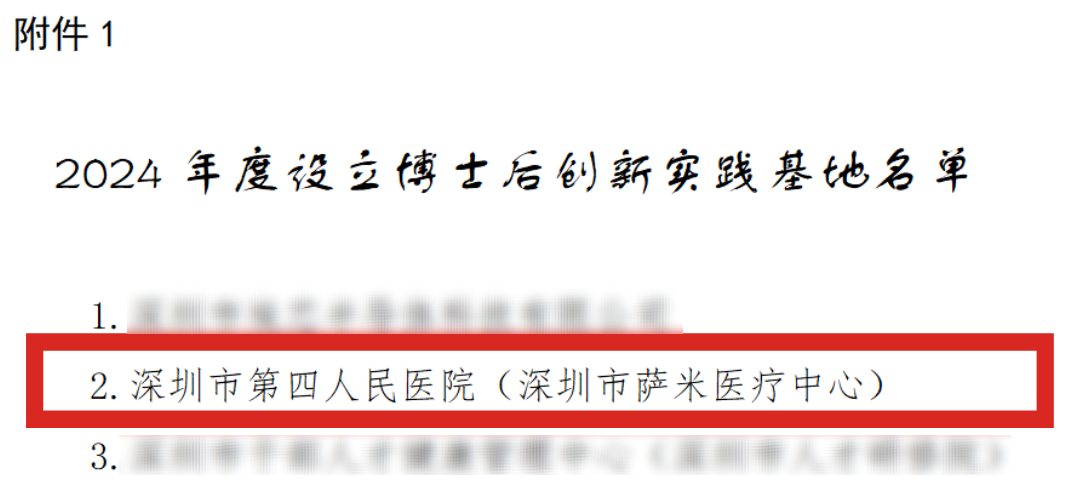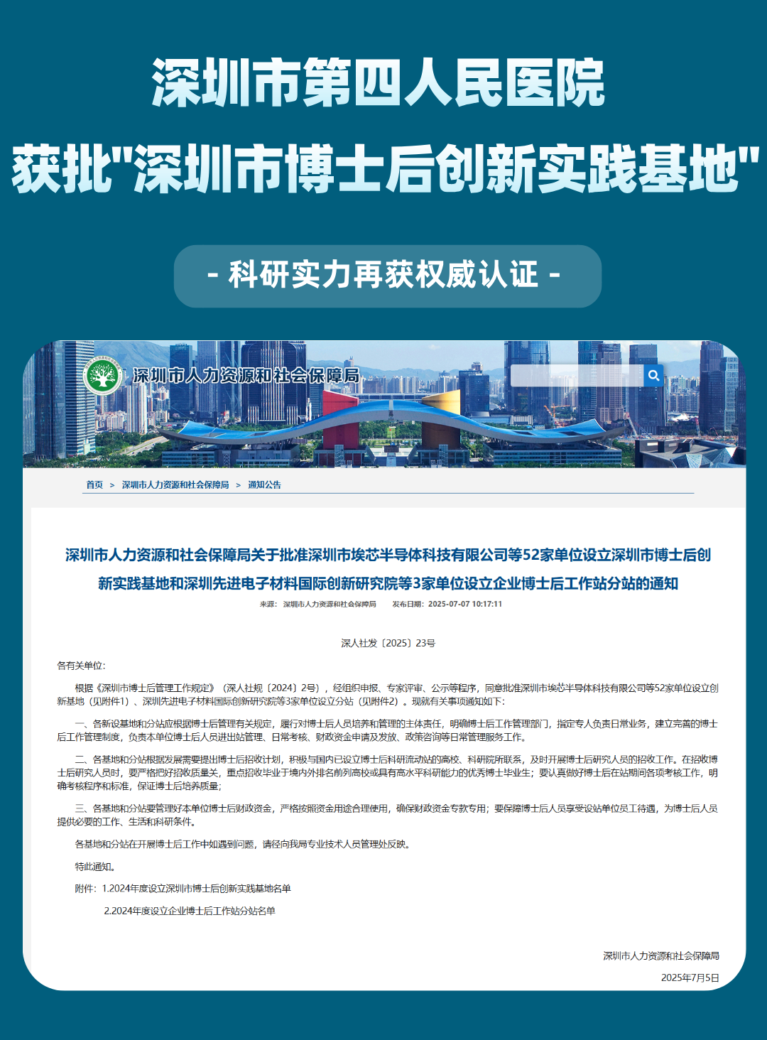 Recently, the Human Resources and Social Security Bureau of Shenzhen Municipality released the list of organizations approved in 2024 to establish Shenzhen Postdoctoral Innovation Practice Bases, and the Fourth People’s Hospital of Shenzhen is honored to be selected. This year, Shenzhen has approved the establishment of 52 postdoctoral innovation practice bases.