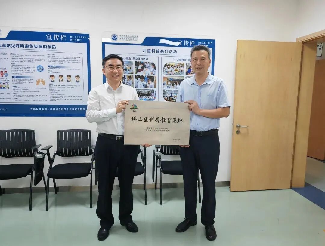 On June 27, 2025, LIU Weidong, Chairman of the Association for Science and Technology of Pingshan District, visited the Fourth People’s Hospital of Shenzhen (Shenzhen Samii Medical Center) to officially award us the plaque of “PublicScienceEducation Base of Pingshan District.” Following the solemn plaque awarding ceremony, Chairman LIU conducted an on-site inspection to evaluate the progress of the hospital’s public science education base and its regular activities, highly praising the innovative model that combines medical expertise with community service. TAO Zhenwei from the Work Department of Science and Technology Association of the Science and Technology Innovation Bureau of Pingshan District, along with ZHAO Yanqiu and WEN Xueliang from the Research & Teaching Department of the Fourth People’s Hospital of Shenzhen, attended the plaque awarding ceremony.