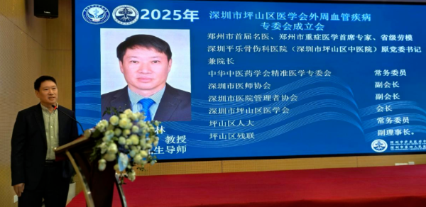坪山区医学会会长李保林出席会议并讲话,他指出,外周血管疾病专委会的成立,将进一步聚焦血管疾病诊疗技术发展,在临床技术推广、学术研究协作、继续医学教育等方面发挥平台作用,助力提升坪山区血管外科整体诊疗水平与学术影响力。