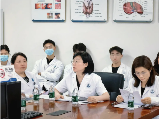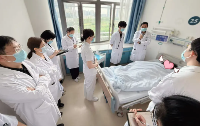 随后,教学查房进入实操环节。临床医学专业实习生在床旁进行病史汇报与体格检查,其他同学及管床医生进行了补充。赵宏峰主任针对学生问诊全面性、体格检查规范性等进行现场点评与示教,充分彰显人文关怀,展现专业素养。在示教室讨论环节,医护人员与实习生围绕患者的临床问题及教学目标,积极互动,参与病情分析与讨论。大家发言踊跃、思维敏捷,充分展现出扎实的知识储备与良好的临床潜力。